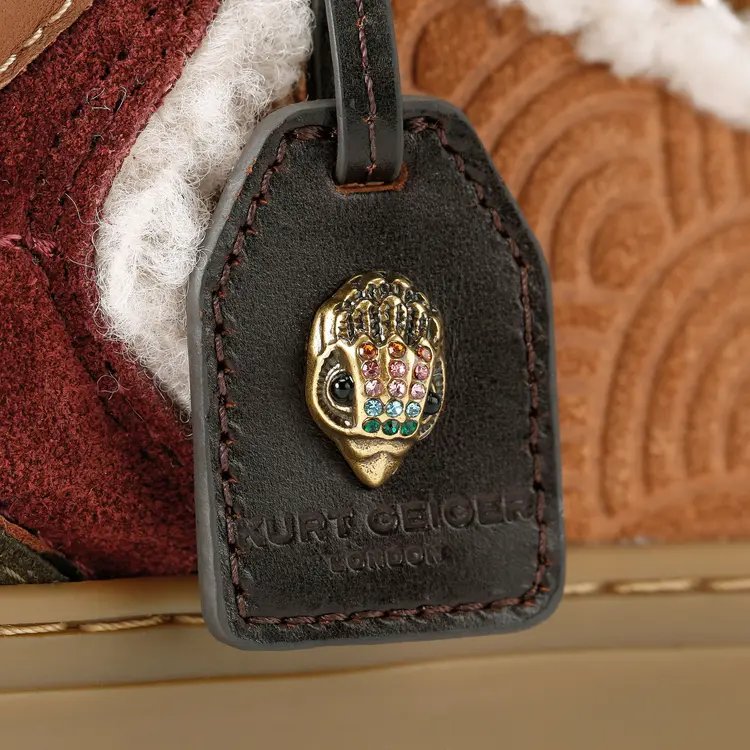 Το sneaker Southbank Tag διαθέτει καφέ σουέτ επάνω μέρος με σχέδιο ουράνιου τόξου και λεπτομέρειες επένδυσης Borg. Υπάρχει μια αντίκα ορειχάλκινη κεφαλή αετού στη μικρή σκούρα καφέ ετικέτα. Τα κορδόνια είναι υφασμένα σε γούνινο στυλ.