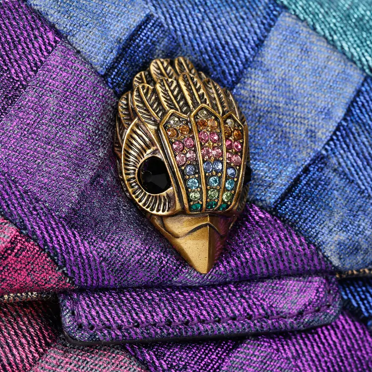 Αυτή η τσάντα Mini Kensington είναι κατασκευασμένη από πλυμένο τζιν με εκτύπωση ύφανσης και χρυσό φύλλο. Το αντικέ ορειχάλκινο κεφάλι αετού διαθέτει κρυστάλλους στο μπροστινό καπάκι.