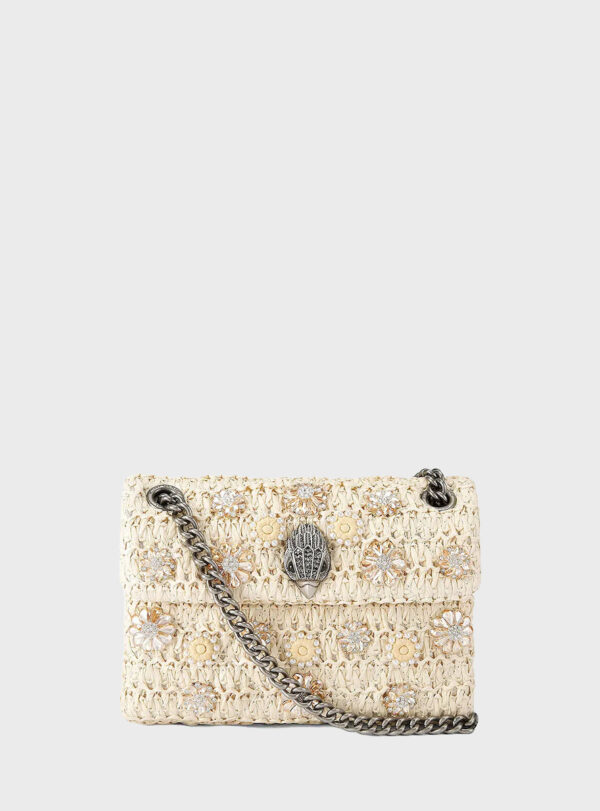 Η τσάντα Mini Kensington είναι κατασκευασμένη από ύφασμα με πορτοκαλί στάμπα πεταλούδας, ραφές στο πάνω μέρος και διάφανες πούλιες. Το μπροστινό καπάκι είναι διακοσμημένο με λουλούδια ράφια και μια αντίκα ορειχάλκινη κεφαλή αετού.