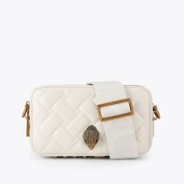 Αυτή η τσάντα ώμου Mini Kurt είναι κατασκευασμένη από μπεζ ύφασμα σε χρώμα κυνηγόσκυλου, διακοσμημένο με ιριδίζοντα κρύσταλλα. Στο μπροστινό μέρος της τσάντας υπάρχει μια αντίκα κεφαλή αετού από ορείχαλκο.